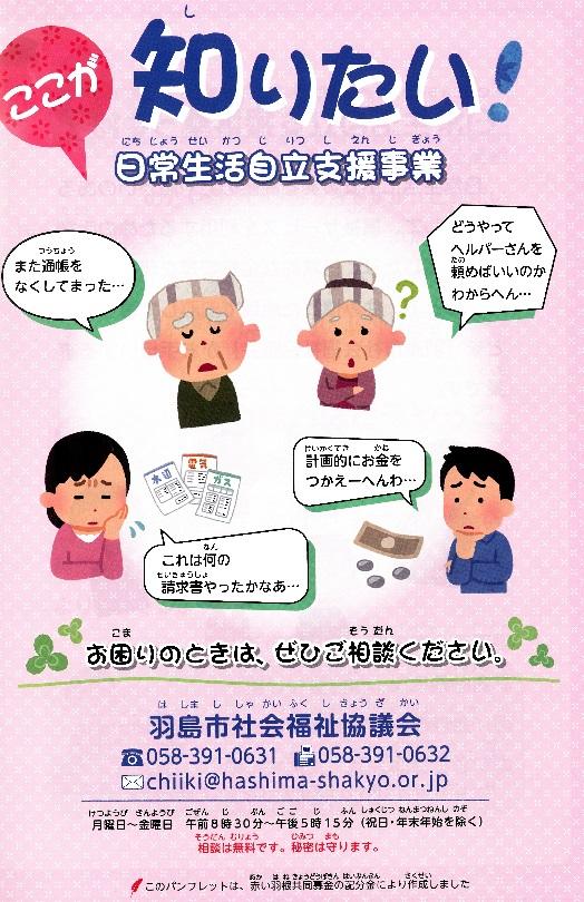 岐阜県社会福協議会の事業である日常生活自立支援事業は、平成27年度より本会が委託を受けて実施している。そこで住民により幅広く日常生活支援事業を広報するため、同事業の内容を分かりやすく説明した印刷物を作成し、同事業の利用促進を図りたい。