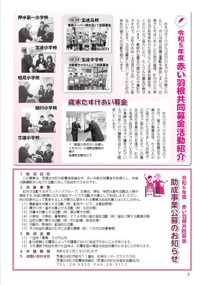 年4回社協だよりを発行し、社会福祉協議会が行う地域福祉推進事業及び共同募金等の事業内容を町民に周知することを目的とする。