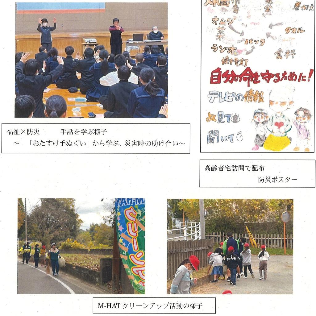 本年度も、本校の福祉教育活動にご理解とご協力いただき、ありがとうございます。コロナ感染症も落ちつき、本年度は多くの取組を実施することができました。先生と子どもたちが、関わる方々への思いを込め、それぞれ工夫を凝らし積極的に活動することができたと思います。これらの活動においては、本助成金をいただきました、共同募金会をはじめ、校区社会福祉協議会、まちづくり協議会、民生委員児童委員協議会などの地域の方々の温かいご支援とご協力のおかげと感謝しております。次年度も引き続き、強度を愛する心あたたかな子どもたちを育み、地域とのつながり、貢献できるような活動を継続して行く所存です。今後も子どもたちの活動をご支援いただきますよう、お願いいたします。