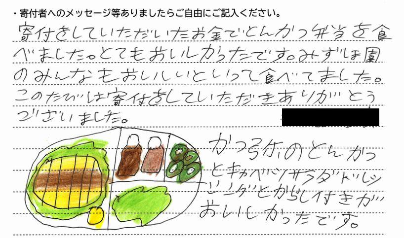 ・寄付をしていただいたお金でとんかつ弁当を食べました。とてもおいしかったです。みずほ園のみんなもおいしいをいって食べてました。このたびは寄付をしていただきありがとうございました。