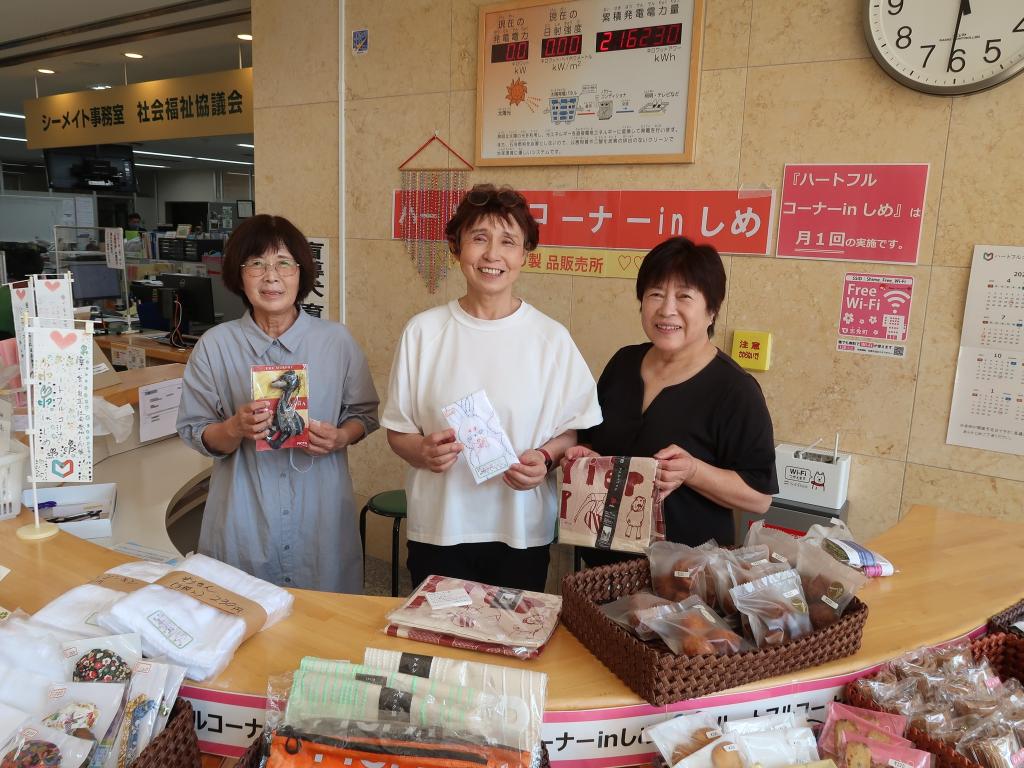 志免町ボランティア連絡協議会は福祉関係のボランティア団体で構成され、団体相互の交流や連携をしながら活動をしています。志免町障がい児・者団体連絡協議会こころのまど、社会福祉協議会と共催で障がい者福祉の啓発イベントを行ったり、障がい者事業所で製作された「まごころ製品」の販売を月1回行っています。写真はまごころ製品の販売会(ハートフルコーナー㏌しめ)の様子です。