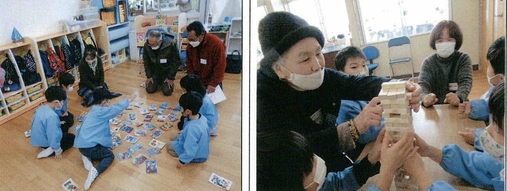 老人会の方と公民館長さん合わせて13名が来園し、年長児が10名ずつの3グループになり、自己紹介の後、昔遊びとして、カルタ、コマ回し、あやとり、オセロ、ジェンガなどを一緒に楽しむ。少人数に分かれてのゆったりとした交流になったので、より密に親しみを持ってふれあう事が出来た。