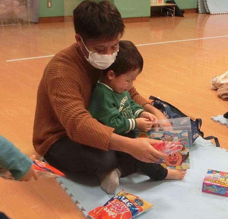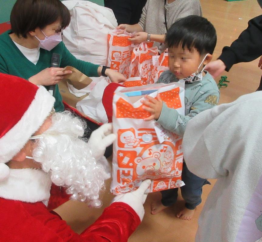 の度は助成をいただきありがとうございました。乳幼児の利用者さんを対象にクリスマス会を開催し、賑やかに過ごしました。製作や紙芝居を見たあとにはサンタさんが登場し、プレゼントを受け取った子どもたちからは「やったー!」「パズルが入ってた!」と嬉しそうな声も聞かれました。保護者の方からも「子どもが楽しそうに参加していた」等感想をいただき、楽しい一日になりました。