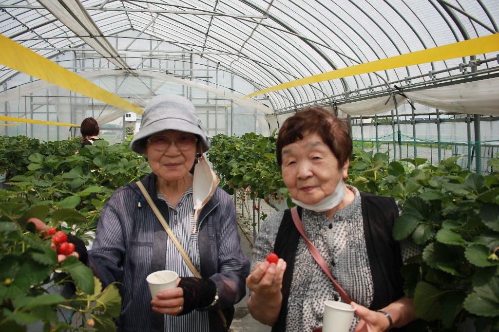 町内在住の70歳以上一人暮らし高齢者を対象に、田舎館村の観光いちご園でいちご狩りを行い、その後、平川市のつがる温泉に移動して交流会を行い、参加された皆さんの心身のリフレッシュとなりました。