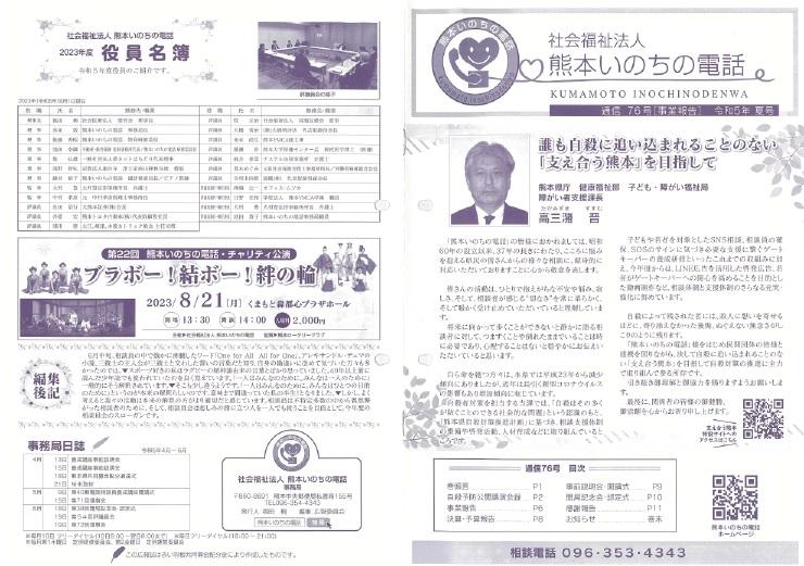 自殺予防のための電話相談事業の継続のためには、相談員の募集、育成、そして命の大切さの啓発活動と、活動に共感する支援者の拡大が重要で、その手段として広報誌を発行している。年3回の発行として、各回1,660部製作し、支援をしている団体をはじめ、県内の主要企業、行政機関などに配付することにしている。
