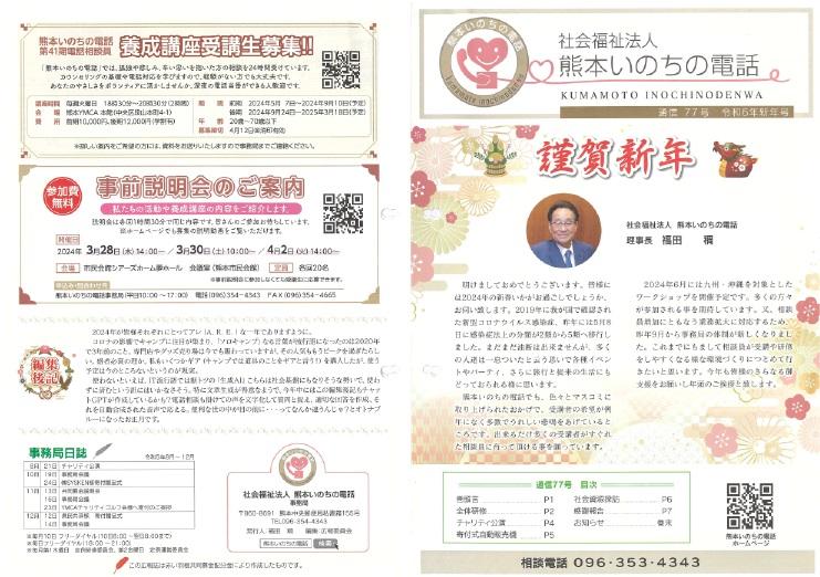 私達「熊本いのちの電話」は自殺予防を目的として孤独や不安に悩んでいる方々からの電話を24時間365日年中無休で約100名のボランティアの相談員が受けています。全国の自殺者数はここ10年で減少してきましたが、コロナや有名人の自殺の連鎖により令和2年以来自殺者数は増加し、それに比例してかかってくる電話も増加しています。一方相談員は高齢化、家庭の事情、コロナ禍で減少しており、相談員の増員が急務の課題となっています。そのため、相談員を養成する講座の受講生を募集するためには広報誌の役割が大きく、その発行のための印刷・郵送費に皆さまからの浄財を活用させていただき、お陰様で令和5年度の養成講座の募集人数が大幅に増加いたしました、令和6年度も期待しているところです。皆さまからのご寄付により一人でも自殺を思い止める方が増えますよう、有効に活用させていただきます。ご支援に感謝申しあげます。