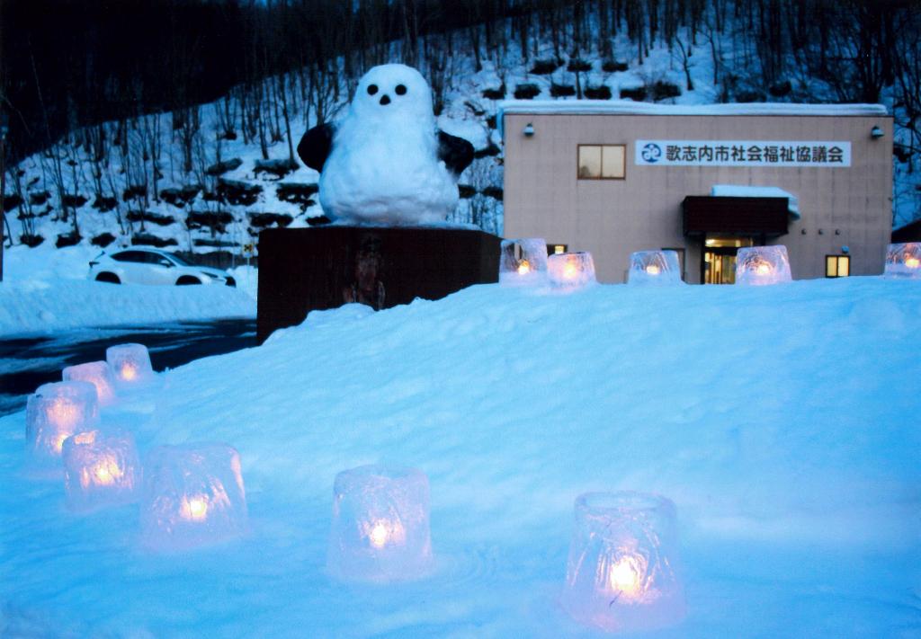 歌志内市社会福祉協議会では、多くの方に笑顔を届けたいと、Smileプロジェクトを実施しています。春から秋にかけては社会福祉協議会建物前に森の妖精コキア(ほうき草)を植栽したり、冬は市内ボランティア団体の「ウタピリカ」と市内社会福祉法人、歌志内市社会福祉協議会、歌志内市共同募金委員会の協働で道の駅、福祉施設2ヶ所と社会福祉協議会建物内にペットボトルツリーを作成し、点灯しました。2月にはバレンタインナイトと称し、社会福祉協議会の事務所前にアイスキャンドルを設置し、雪像も作るなど、多くの市民に楽しんでいただくことができました。ありがとうございました。