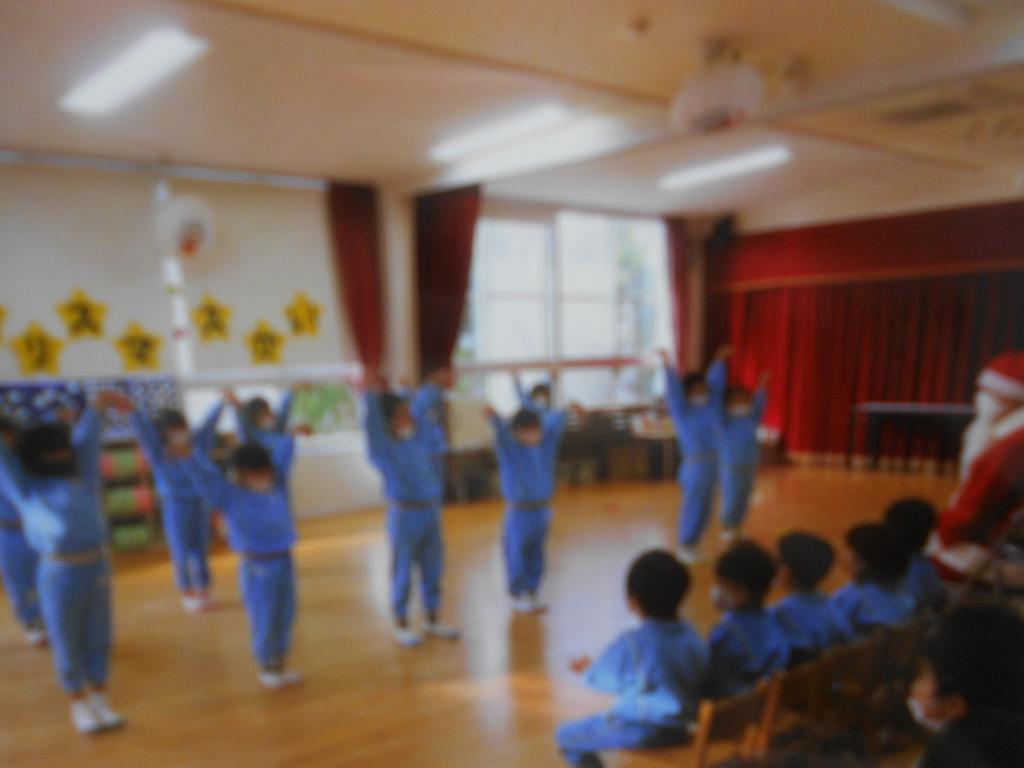 今年も北の国からサンタさんがプレゼントを持って来てくれました。「この袋の中には何がはいっているかな?」とサンタさんが尋ねると、「お菓子!」と嬉しそうな子供たち。一人ずつ配ってもらい、中にはサンタとハイタッチや握手をしてもらう子もいました。プレゼントのお礼にダンスやボディパーカッション、リズム奏を披露しました。「来年もまた、来てね」と来年のクリスマスをも楽しみにしている子どもたちでした。サンタさんとのすてきな時間をありがとうございました。