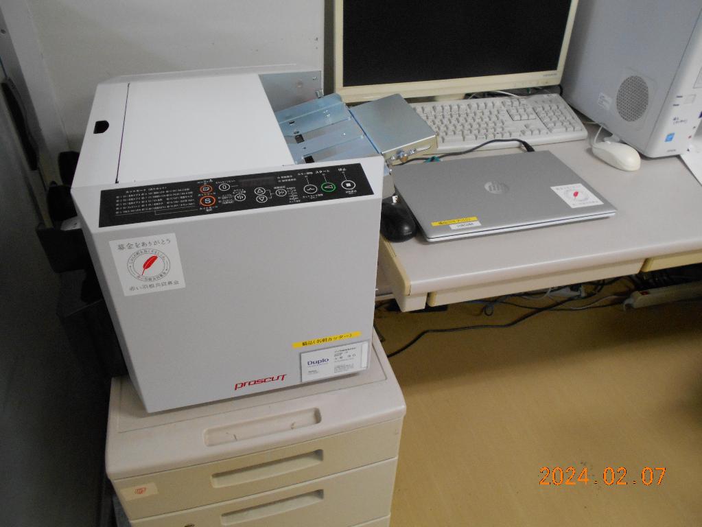 当施設は、身体障害者授産施設として開所し、現在は知的障がい者や難病を患っている方も受け入れています。開所当初から取り組んできたのが印刷業務です。パソコンを利用し、レイアウトから印刷、製本に至る作業をしています。特に脳血管性で片麻痺になられた方や車いすを利用されている障がい者の方等には、自立に向けたスキルの向上としての意味合いも持っています。しかし、パソコン等の電気機器は年々新しくなり、10年以上も古いパソコンでの作業は、相当効率も悪くなっていた中、配分金を受領することができ、性能の良いパソコンに切り替えることができました。お蔭様で利用者の仕事への意欲も一段と高まっています。本当にありがとうございました。