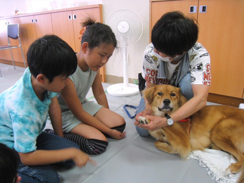 動物愛護教室では、中部保健所の職員さんと動物愛護ボランティアさん8名(犬9頭)をお招きし、動物を飼うことの責任や正しい触れ合い方を学びました。触れ合い体験では、子どもたちが学びを活かして犬に対して優しく接する姿が見受けられました。