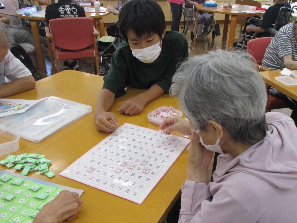高齢者施設体験では、中学生がデイサービスで体験を行い、施設利用者の方と一緒に脳トレやレクリエーションをして交流しました。緊張しながらも、思いやりのある声掛けや会話をする姿が見受けられました。