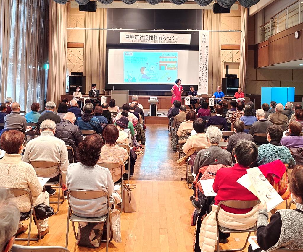 認知症や知的障がい、精神障がい等により判断能力が不十分な方々の権利擁護のために社協が法人後見事業の実施や権利擁護にかかかわる総合相談・住民向けのセミナー開催など権利擁護の意識向上を推進する。