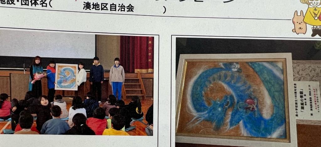 2024年2月10日が創立150周年を向けた湊小学校への地域からの贈り物に絵画の作成をしました。作者の増田薫さんは、子ども議会の湊地区キャラクター作成、湊小学校と湊地区づくり協議会の壁画プロジェクトに協力して頂いているご縁からお願いし実現しました。
