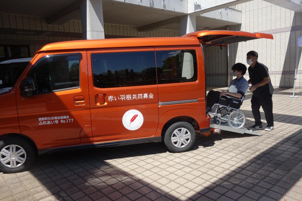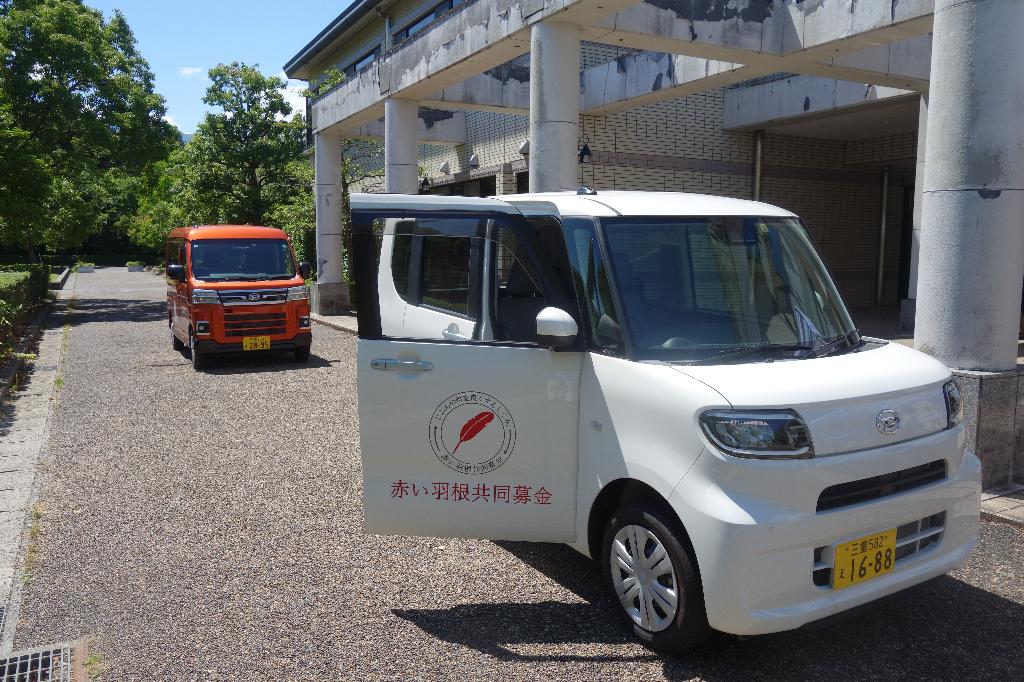赤い羽根共同募金のマークが大きく描かれた福祉車両3台は、通院やお出かけなど