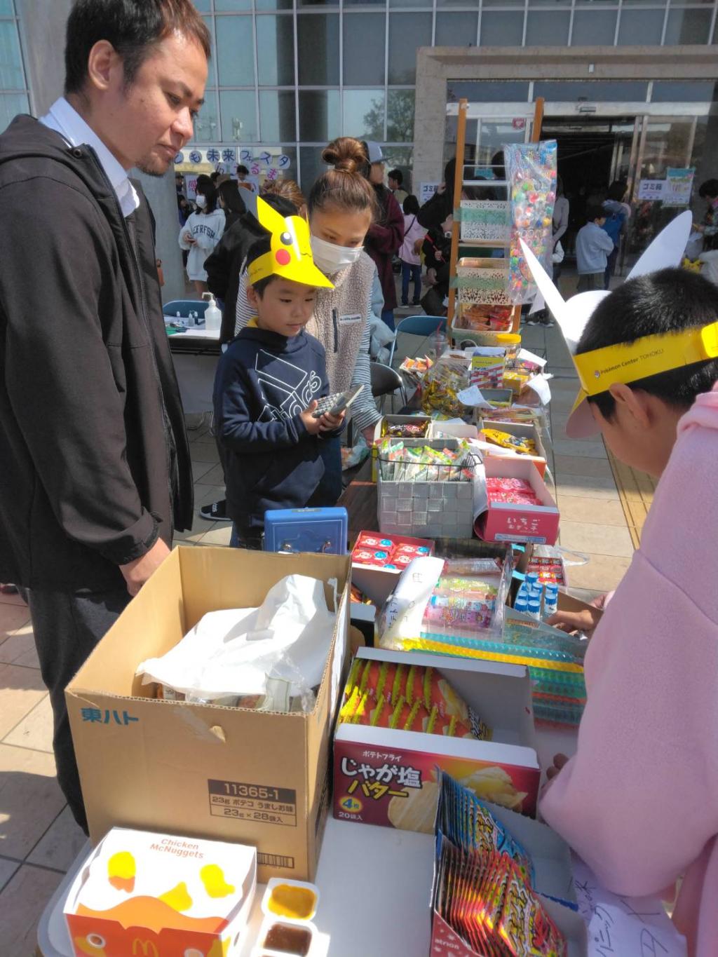 子ども未来フェスタでは、助成金を活用しゲームコーナーやわたあめ作り体験、ピカチュウとの写真撮影等を行い、2,000人余りの来場がありました。また、うるま市内のこどもの居場所のこども達が運営するブースや子ども用品のフリーマーケット、制服リユース等もあり、子ども達の体験の場、子育て家庭の助けとなるイベントとなりました。
