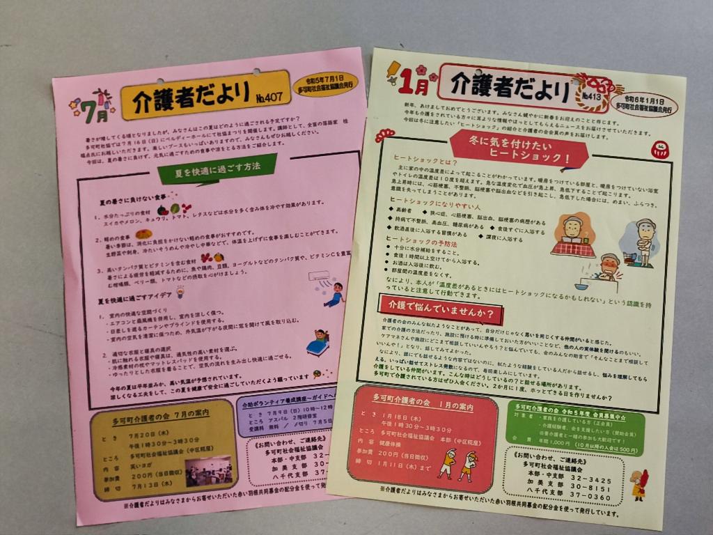 介護に役立つ情報や介護者の会の活動をお知らせするために「介護者だより」を毎月発行し、町内の介護者に配布する。