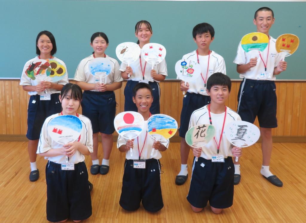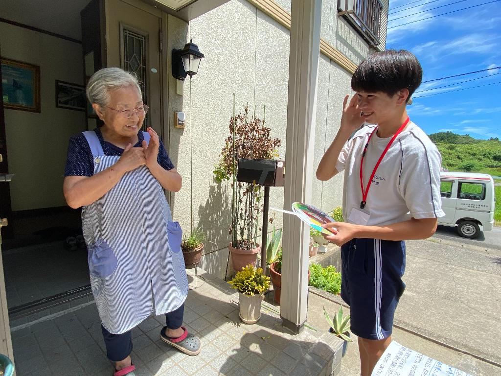 今回のボランティア活動では、中学生が作成した手作りのうちわを、給食サービスの配達の際に利用者の方へ直接お渡ししました。手作りのプレゼントをもらった皆さんは、「すごいね。上手にできているね。」と、とても喜ばれていました。