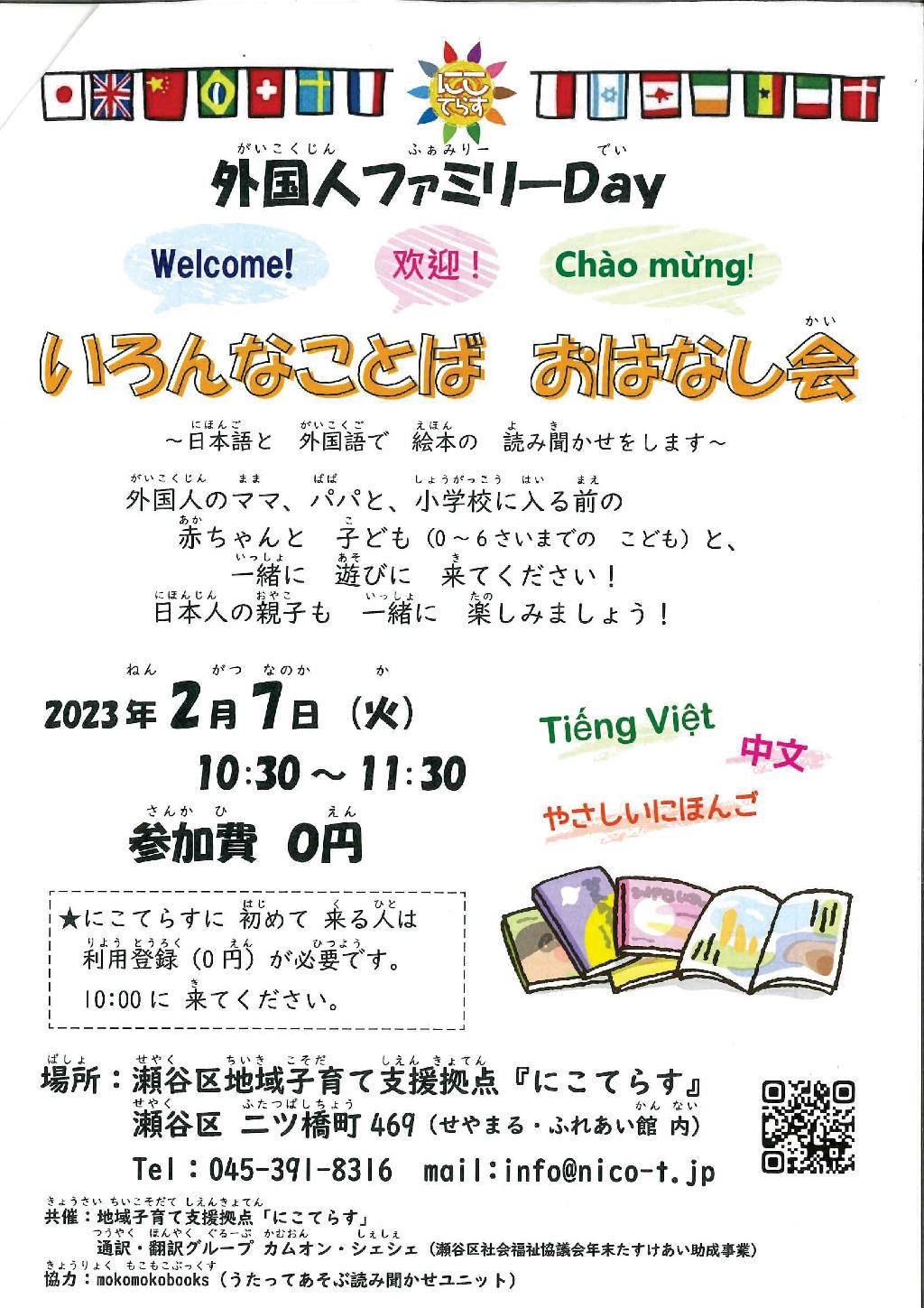 ・日本人も外国人も同じように安心して子育てできる「瀬谷」であってほしいと思い、活動しています。外国人支援の啓発、多文化の交流、そして困りごとに丁寧に寄り添うことを目指しています。ご支援ありがとうございました。(子育て支援団体)