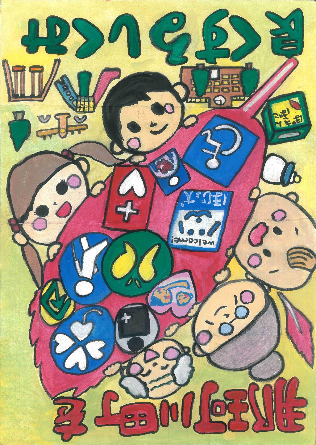 町内の小学生(4~6年生)に「共同募金」をテーマにポスターを描いてもらう。金賞作品は、次年度の当町オリジナル共募ポスターの図案とする。また、展覧会をとおし、広く町民に見てもらうことで、福祉の町づくりに対する関心を高めることを目的とする。