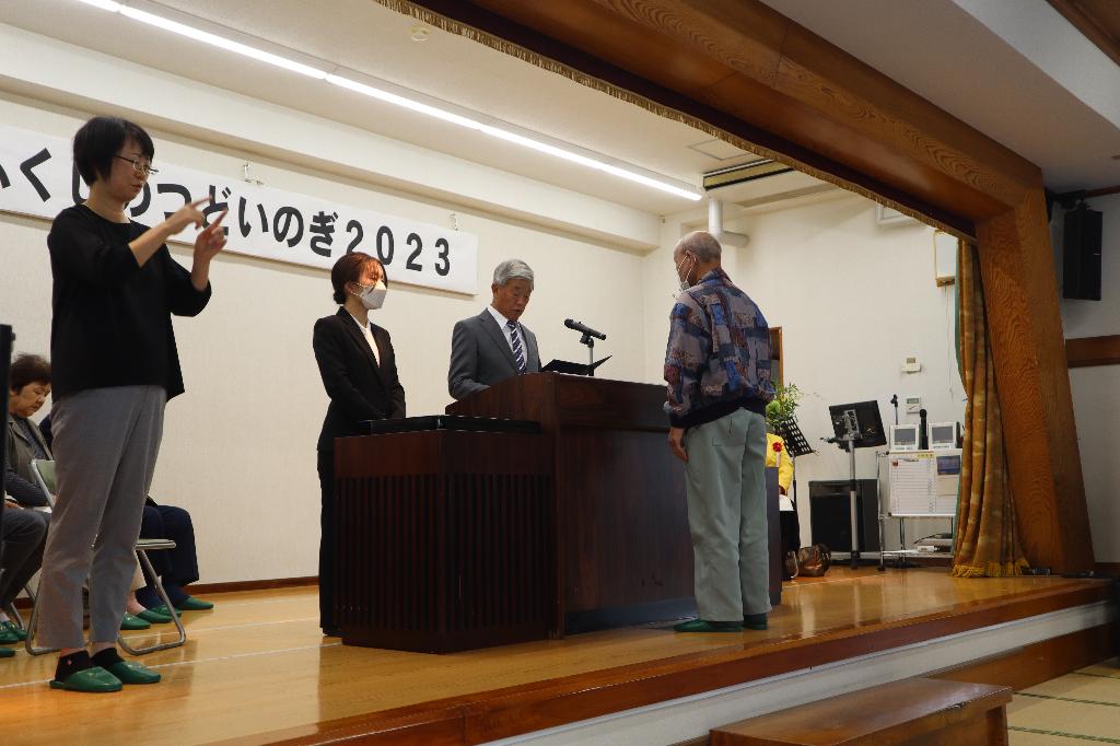 また、日頃から老人福祉センターで活動するサークルによるステージ発表や作品展、中学生や一般ボランティアの協力をいただいた模擬店や子ども向けコーナーも大変賑わい、全て無事に終了することができました。