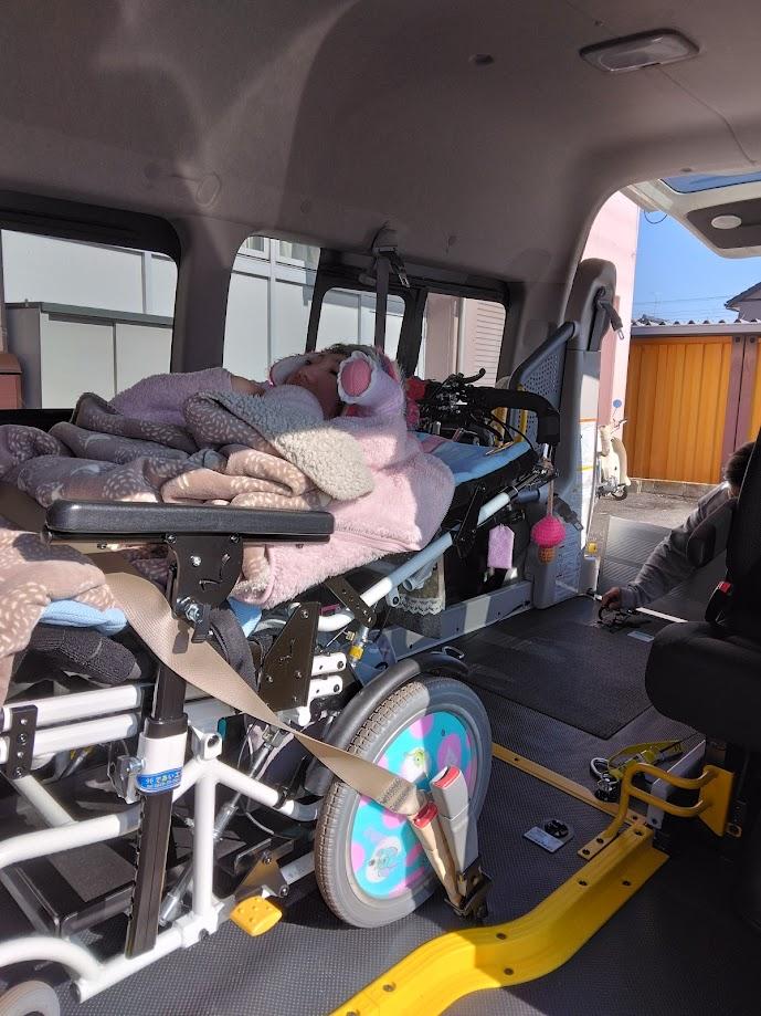 <現在の状況>重症心身障害や医療的ケア(吸引や経管栄養など)が必要な児童が利用している。ストレッチャーや大型車椅子対応の車両で送迎を行っているが、子どもたちの成長に伴い、大型車いす4台乗車可能な車両でも実際には2台しか乗せることができず、車両不足により保護者に送迎をお願いしている状況である。