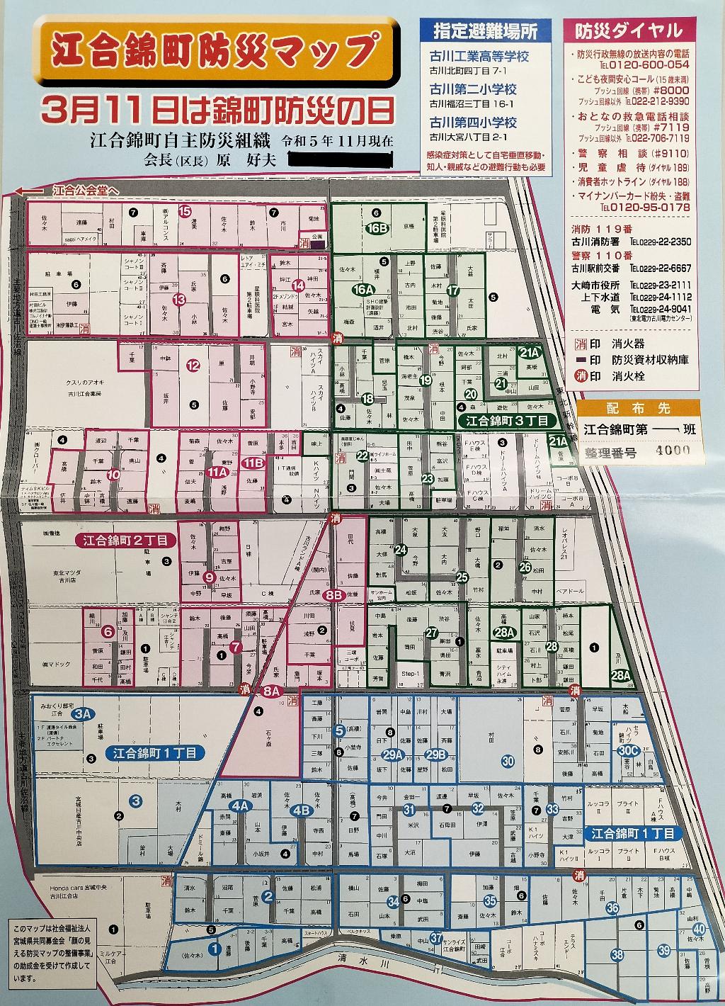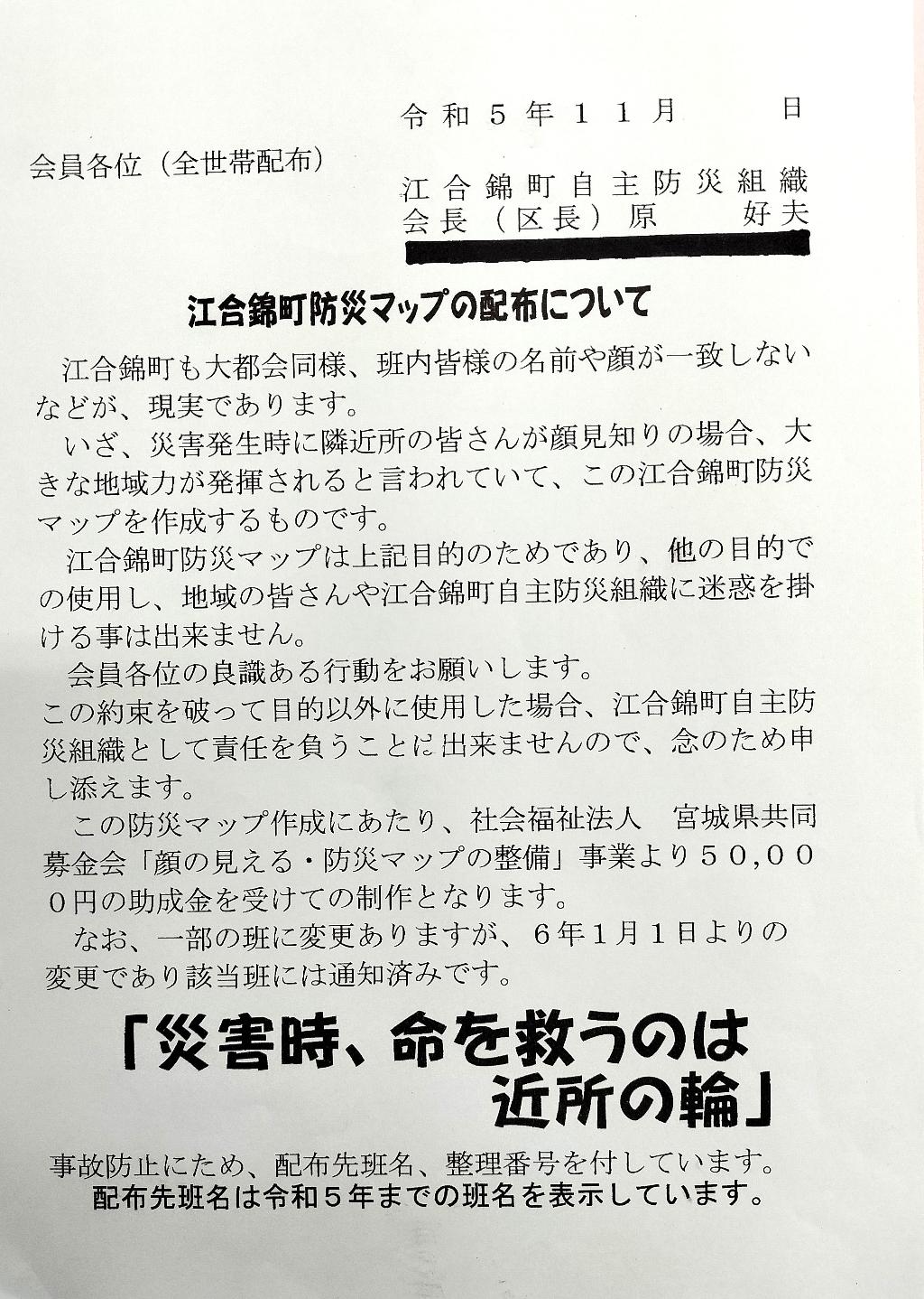 江合錦町も大都会同様、班内皆様の名前や顔が一致しないなどが、現実であります。いざ、災害発生時に隣近所の皆さんが顔見知りの場合、大きな地域力が発揮されると言われており、江合錦町防災マップとポスターを作成するものです。