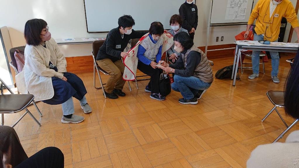 介護予防講座では体組成測定などで自分の身体状況などを知り、フレイル予防のストレッチなどを学んだ。マルシェに参加し、耳が聞こえない人への接し方などを簡単に説明した、防災学習会では、避難所のロールプレイを実施した