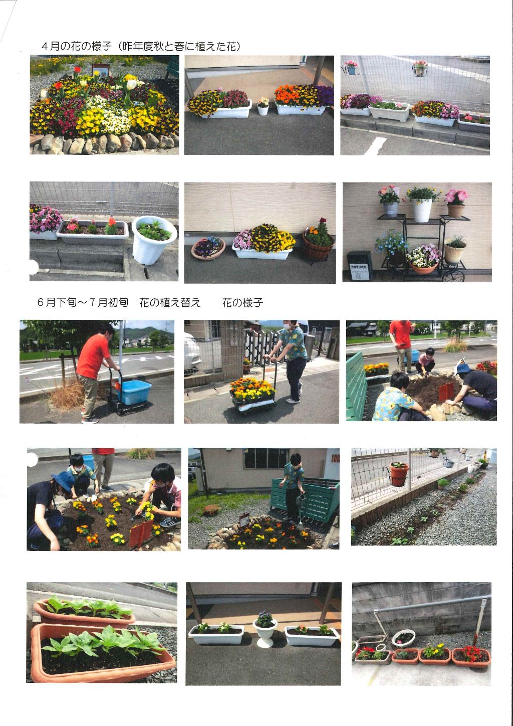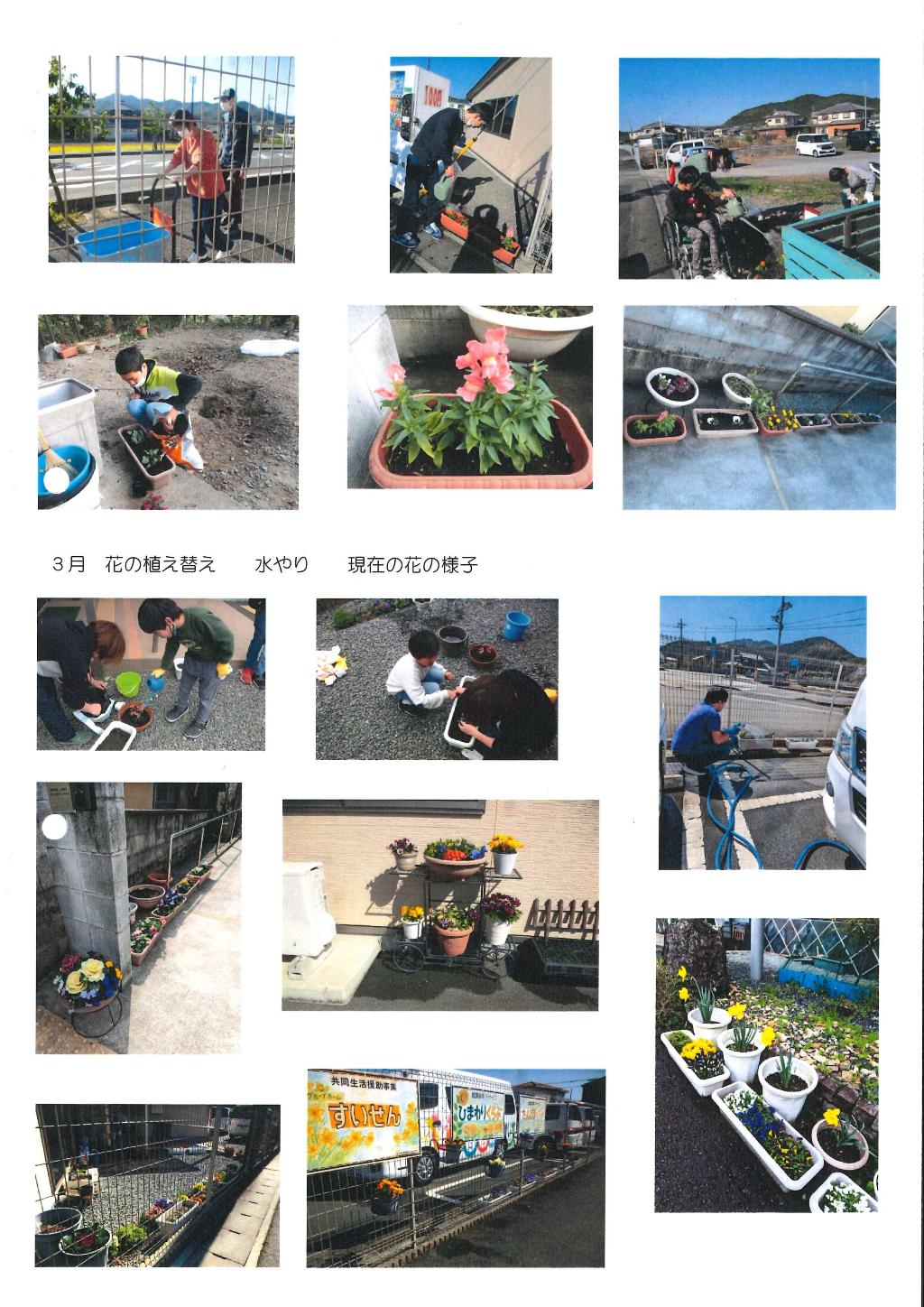はぴねすサポートセンター4事業所で利用者様と季節ごとに花の植え替えを行い(年3回)、花壇、プランターの維持管理を行う。1年を通して、資源回収箱や施設前に花がある環境づくりに努め、日頃の感謝の気持ちを伝えた。