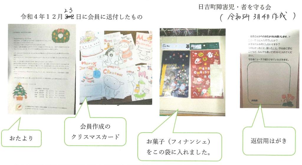 寄付を有難うございました。皆様のおかげで日吉町障害児者を守る会の会員さんにクリスマスカードや冬、春のプレゼント・お便りを送ることができました。コロナ禍で集まることができない中、会員さんの心にあたたかい灯をともすことができ、つながりが実感できました。今後ともよろしくお願いします。