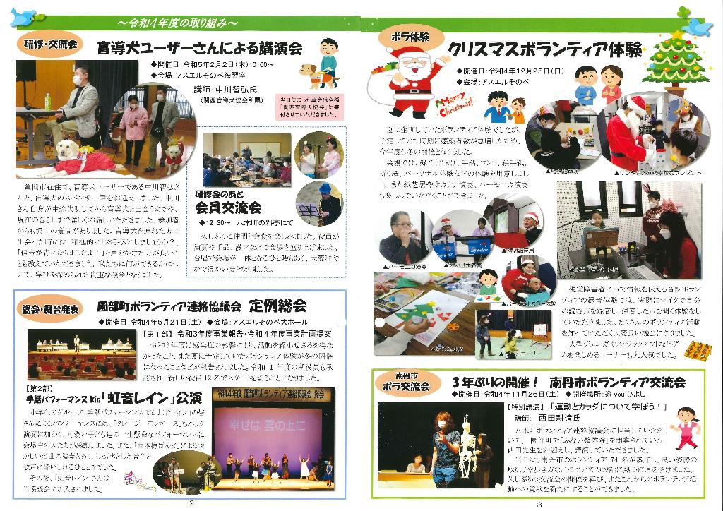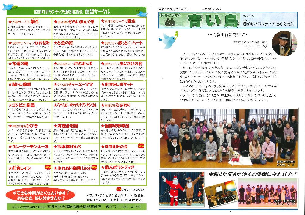 事業計画の打合せ、役員会、代表者会、総会、冬のボランティア体験、4町ボランティア連絡協議会、研修交流会、広報誌「青い鳥」第21号発行