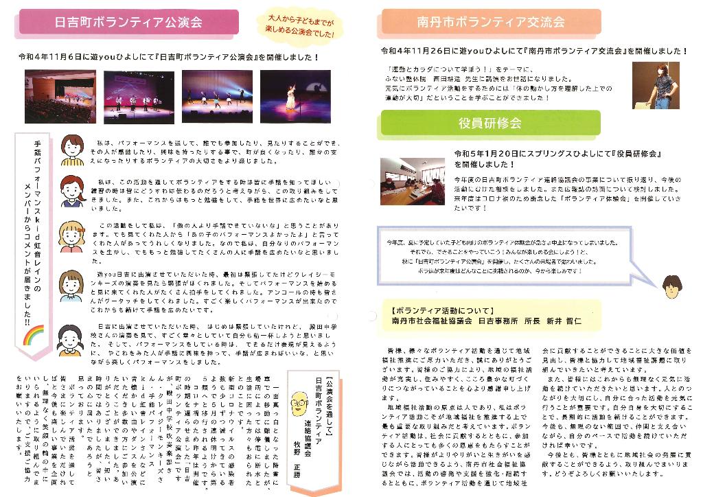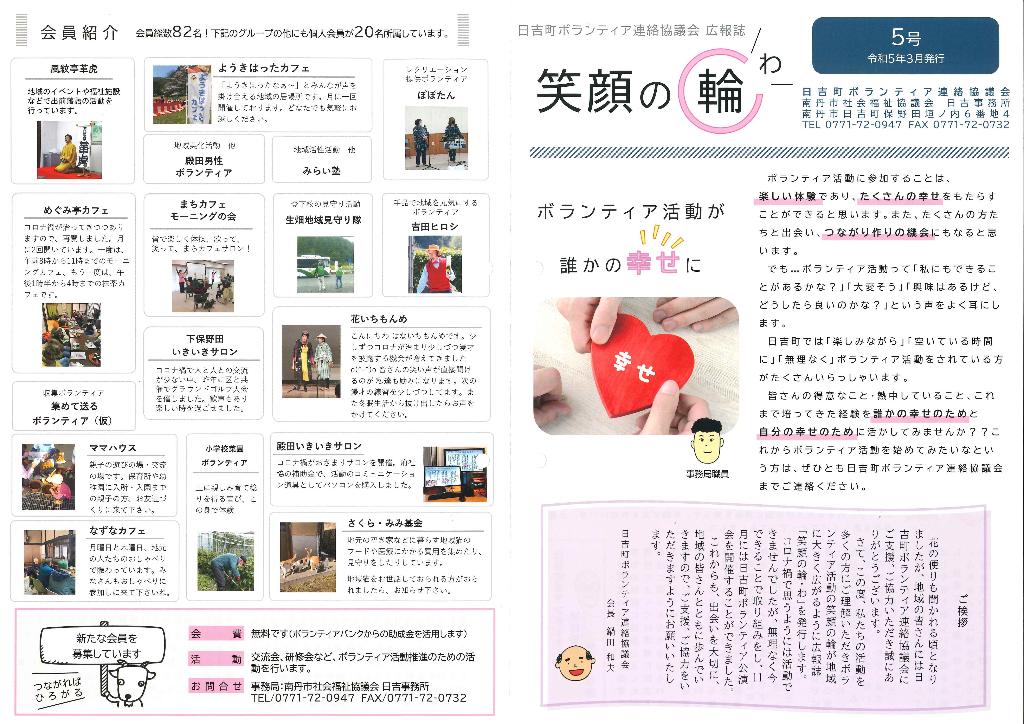 ①広報誌発行「笑顔の輪・わ」②日吉町ボランティア公演会③役員会④その他