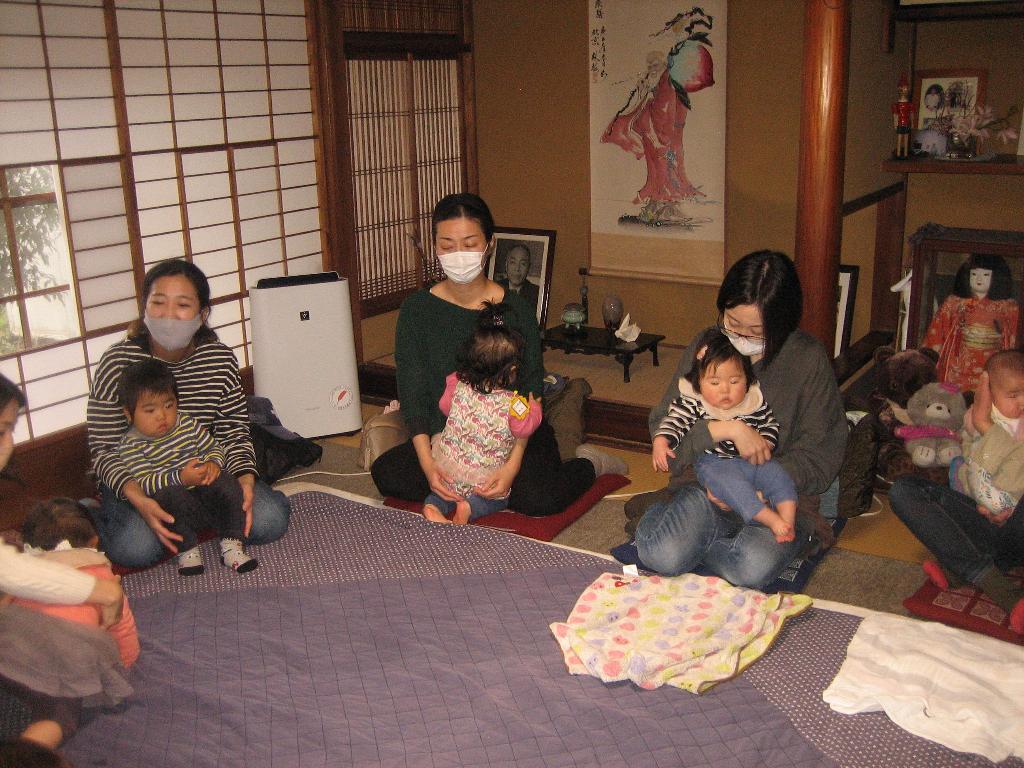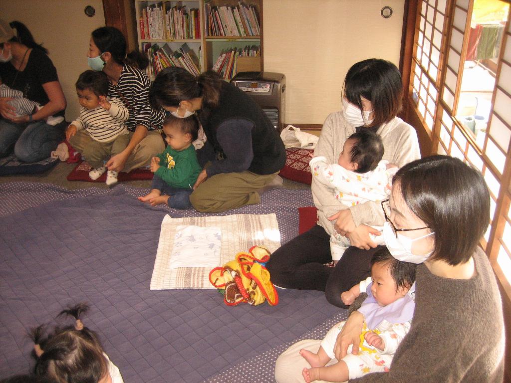 はじまりの歌、名前の紹介の歌を歌って始める。絵本・紙芝居を読んだら手遊び歌などをして、赤ちゃんやお母さんがリラックスしてお話が聞けるようにと心がけ、和太鼓の演奏を身体で楽しむ。