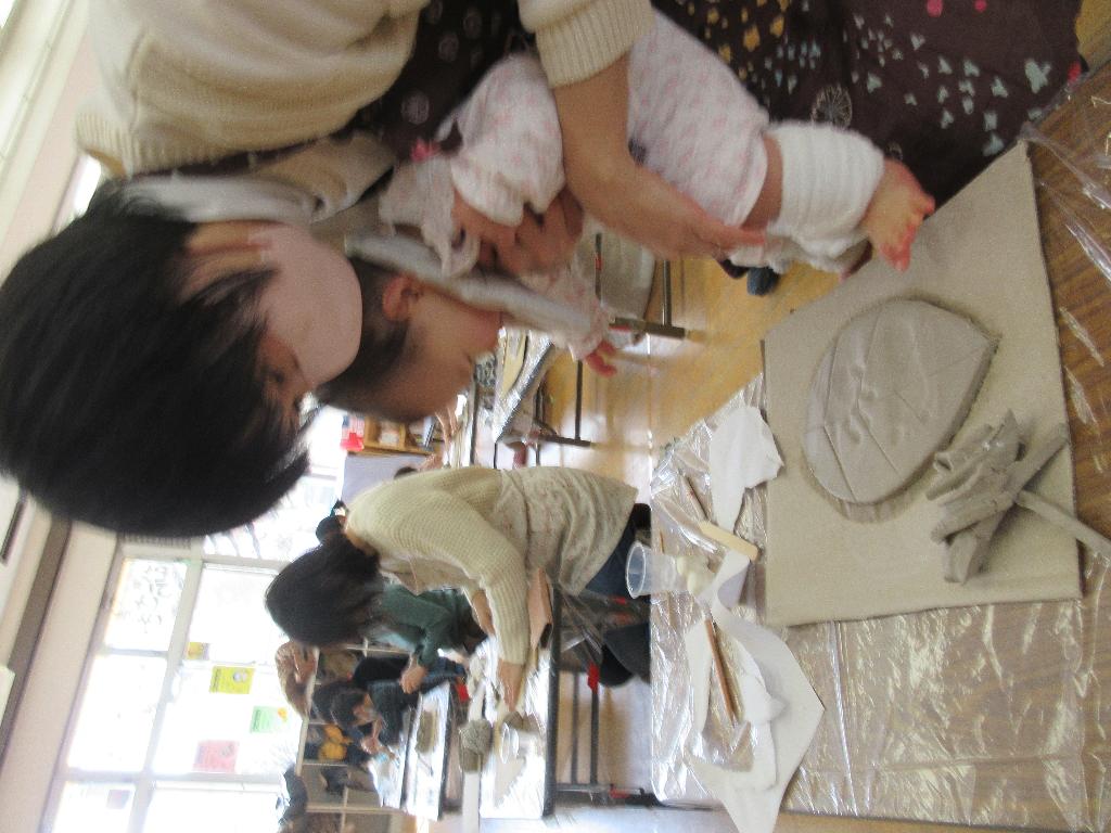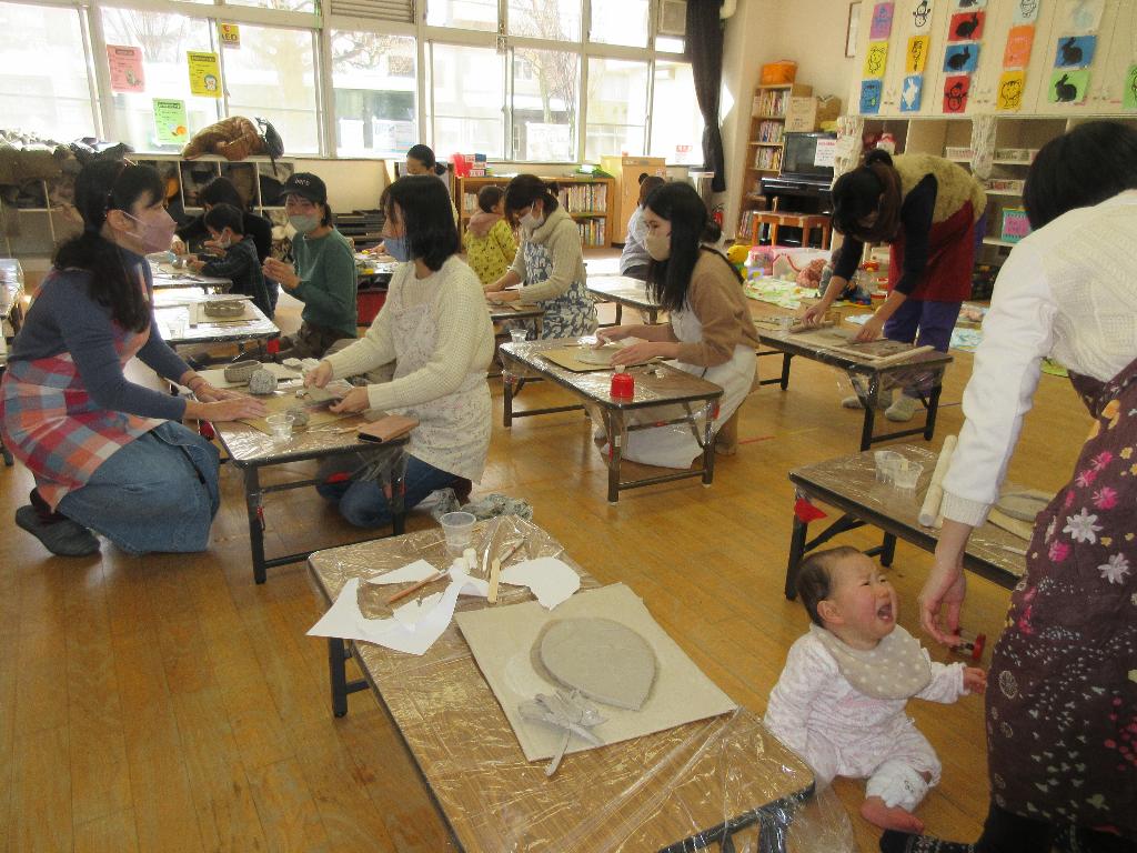 当日は雪が降り、天候が悪く参加者数のキャンセルを心配した。何組かのキャンセルはあったが、天候の割には乳幼児さん親子で参加していただけた。子どもの手形や足型など、親子で楽しそうに思い出に残る記念の作品を作られていた。乳幼児親子で陶芸など体験できる機会は無いので、助成金を共同募金から助成金をいただき、参加費も安価で参加しやすく、参加されたお母さんたちは喜んでおられ、どのような作品に仕上がるかを楽しみにされている。本当にありがとうございました。