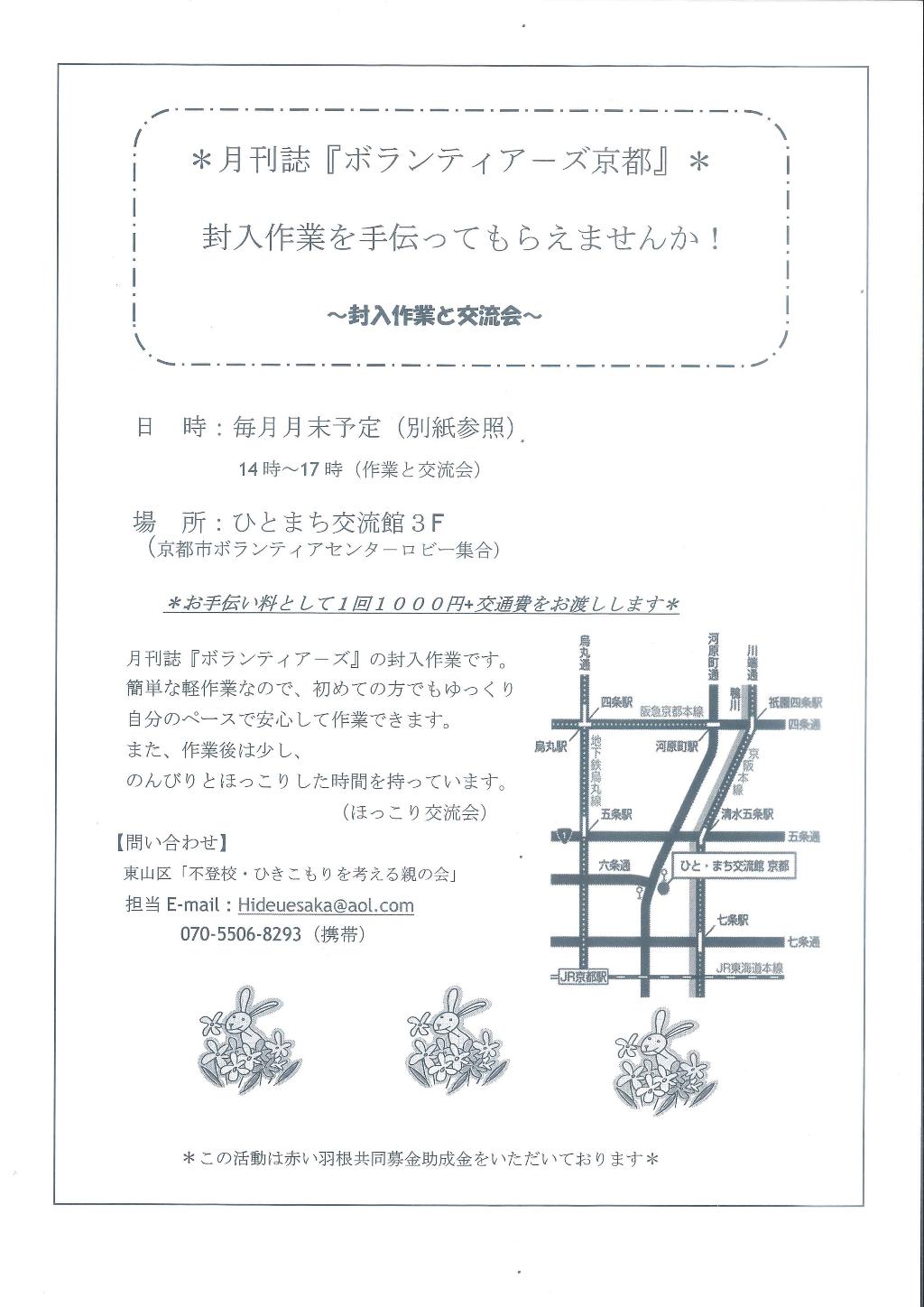 ひきこもり状態にある方への社会参加のファーストステップとしての作業。内容は月刊ボランティアーズを行政各所、学校、支援団体ごとに仕分けし封入作業を行っている。2時間の作業と交流で謝金1000円と交通費を支給。収入がない方ばかりのため、自分が働いたことの実感を持ってもらうため謝金を支出している。交通費については、作業へ来ることのハードルを下げることを目的に支出している。