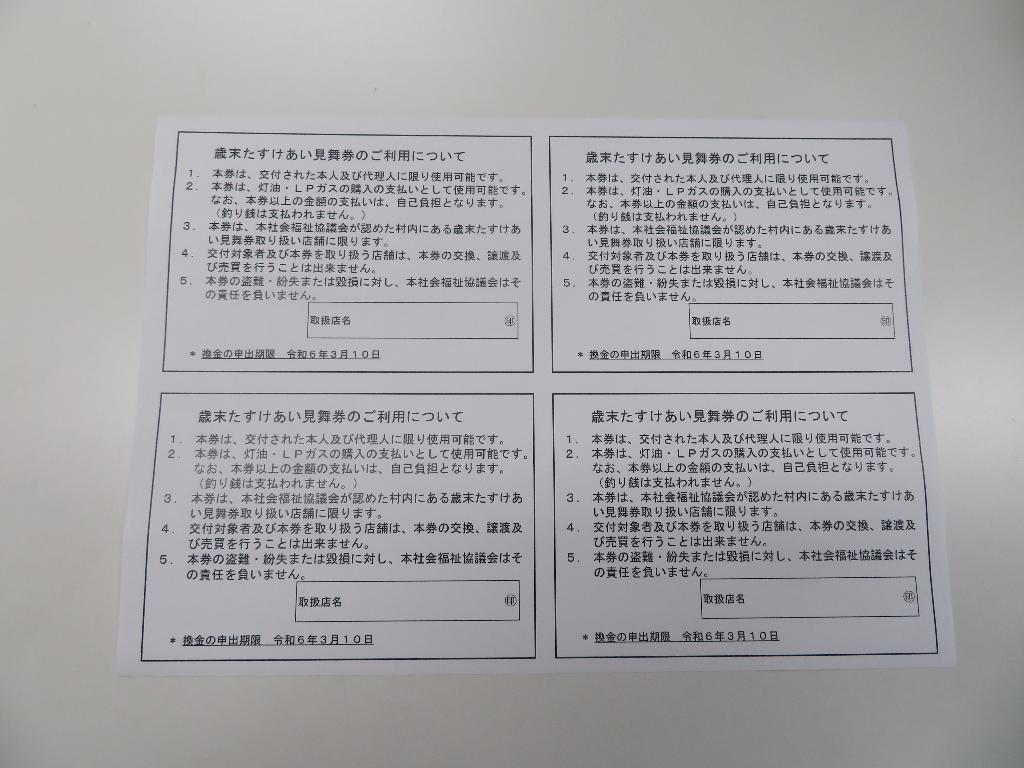 今年度も地域歳末たすけあい助成金により事業を実施することができました。民生委員・当社協役員の協力のもとに、70歳以上の一人暮らしの高齢者、75歳以上の高齢者のみ世帯を対象に、額面3,000円分の灯油・ガス引換見舞券を配付することができました。