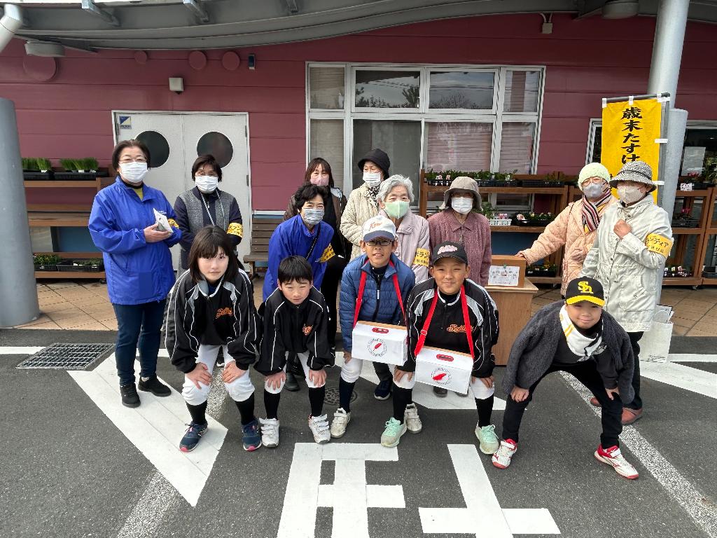 令和6年12月7日、歳末街頭募金を市内9店舗12か所で実施しました。一般ボランティア95名、スポーツ少年団74名、計169名のボランティアの皆さんのご協力をいただき、433,012円の募金が集まりました。共同募金助成は、ボランティアさんへのお茶菓子、保険代、郵送料に使わせていただきました。