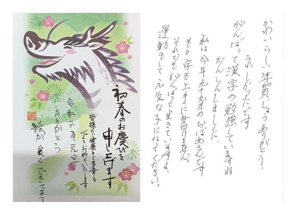 今年は前年より送付先が50名ほど増え、1,137人の高齢者のお宅へ児童が書いた年賀状を届けることができました。年賀状を受け取った高齢者からの御礼の年賀状もたくさん届き、児童へ手渡すと大変喜んでいました。子どもたちの優しい気持ちが込められた年賀状と、高齢者からのあたたかい年賀状を一部掲載させていただきます。ご寄附いただきた皆様には心より感謝申し上げます。どうもありがとうございました。