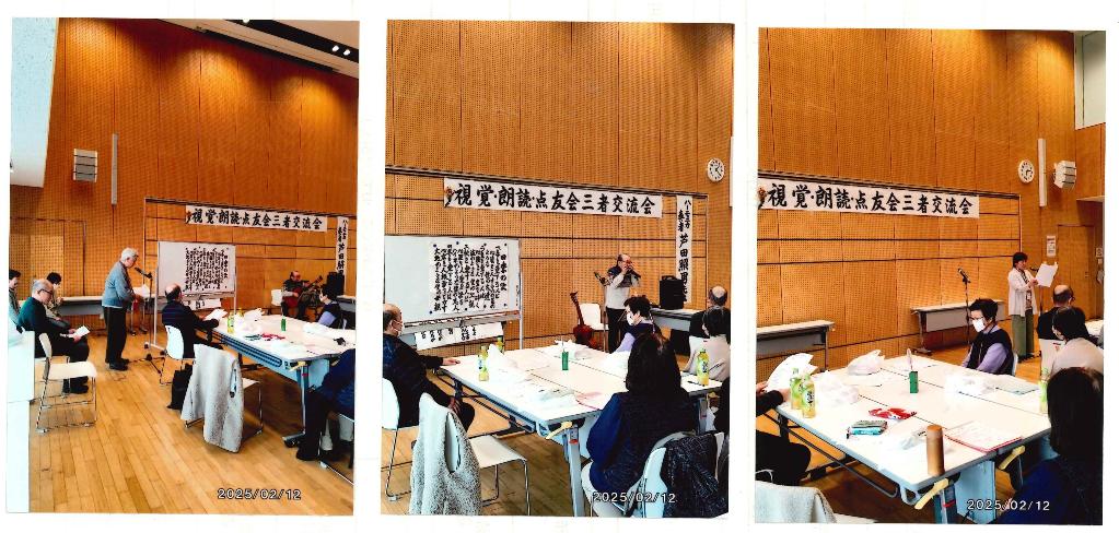 点友会と朗読サークル(3グループ)、視覚障害者協会との親睦を深めることを目的に各テーブルに分かれ、ハーモニカとギター演奏に合わせて10曲ほど歌った。朗読サークルによる3話の朗読の発表があった。