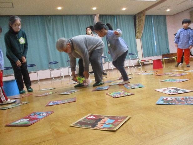 今年度も老人クラブと更生保護婦人会との交流会をしました。5歳児が2クラスあるので、1クラスと老人クラブの方々と交流、1クラスと更生保護女性会との交流をしました。伝承遊びコーナー(あやとり、すごろく、パズル、こま)や大型かるたを楽しんだり、競い合ったり、一緒に遊んでいただき、地域の方々に優しく関わってもらい、いい経験をする事ができました。