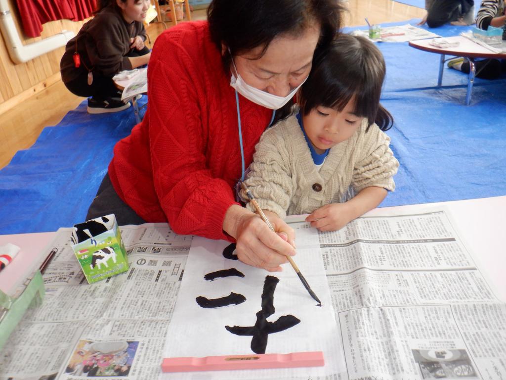 冬休み中家族で、かるたとりやコマ回しを経験し楽しんだ様子。また、凧あげも経験することで、楽しさが分かり風向きなど、コツを覚える機会にもなりました。大空を見上げることで、健康祈願につながることも知らせました。書初めは、更生保護女性会との恒例行事となっており、筆を持って文字を書くことを教えてもらい、心新たにする新年の活動となりました。地域の方とのふれあいにも感謝です。