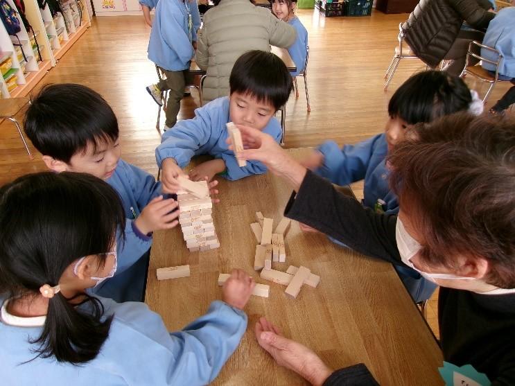 グループに分かれて、一人一人の自己紹介の後に南あわじふるさとカルタ、コマ回し、あやとり、だるま落とし、オセロ、ジェンガ等を楽しみました。 たっぷり、少人数で遊びを通して触れ合う事ができたので、子供達もすっかり打ち解ける事ができ、コマ回しを披露すると「じょうずやねぇ」とほめてもらいうれしそうな子ども達でした。