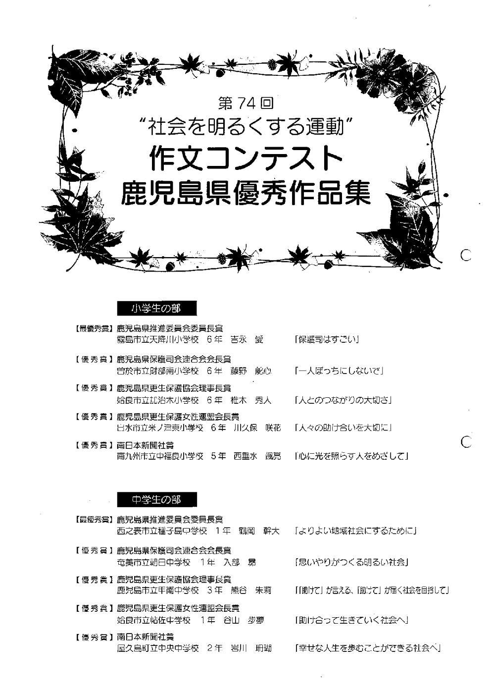 機関誌「更生保護かごしま」を年2回(1回2,000部発行)作成配布し、また全県下で7月1カ月間に亘って「社会を明るくする運動」を展開、更に「社会を明るくする運動作文コンテスト優秀作品集」を