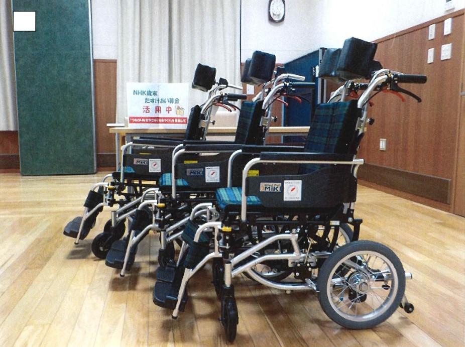 「NHK歳末たすけあい助成金」の交付により、ティルトリクライニング車いす3台を導入することができました。体の不自由なご利用者様にとって、お尻にかかる体圧を腰や背中に分散させることができるので、床ずれの予防につながり大変喜ばれています。