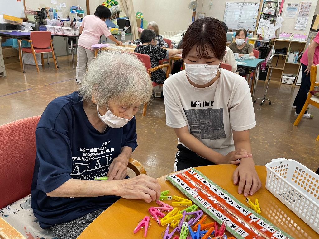 福祉施設体験では、中学生等が町内の高齢者施設にて介護体験を行い、施設利用者の方と一緒に脳トレやレクリエーションをして交流しました。緊張しながらも思いやりのある優しい声かけや会話を楽しむ姿が見受けられました。
