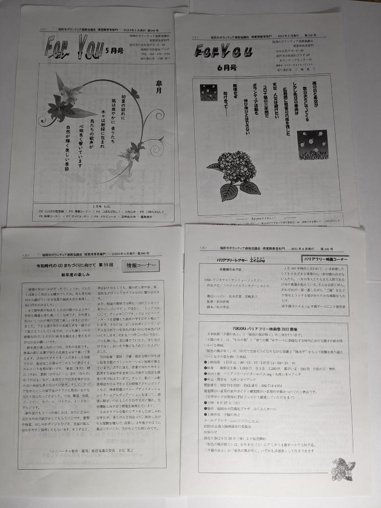 私たちは、福岡市及び近郊でボランティア活動を行っている42のグループで作っている「福岡市ボランティア連絡協議会」です。視覚障がい者部門・聴覚障がい者部門・高齢者部門・障がい児(者)部門・養護部門・その他の部門の加盟グループで構成しています。私たち全体の活動を伝える機関紙「ふれあい」、視覚に障がいのある方のために活動している部門の機関紙「ForYou」を作成し、加盟グループはもちろん、福岡市の公共施設や関係する団体等に届けています。また、視覚障がい者の方々にたいしても、音訳・テキスト訳を届けています。