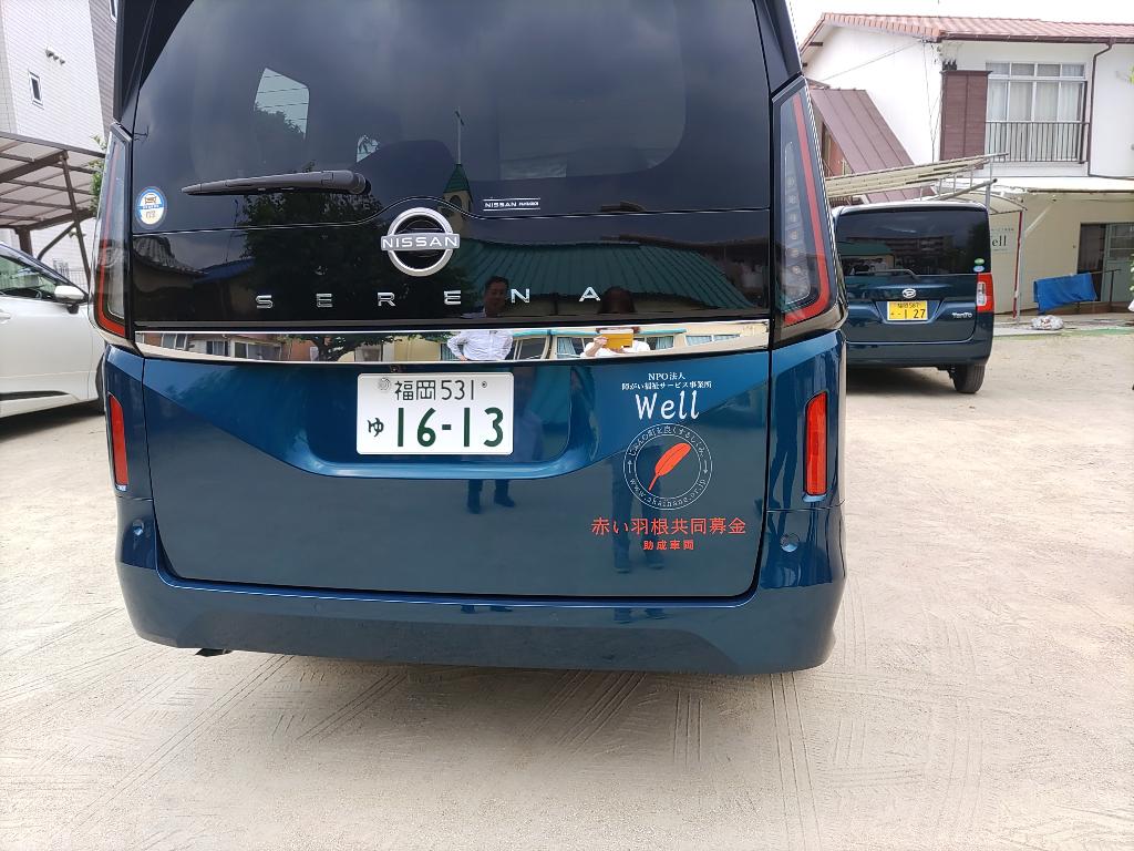 梅雨入り直前の晴れの日に、ブルーの車体に赤い羽根が鮮やかな配分車両が到着すると、利用者のみんなが外に出て、新しい送迎用リフト車を迎えました。障がいの重い利用者、重複障害の利用者が多い私たちの事業所にとって、送迎車両の増車は念願でした。