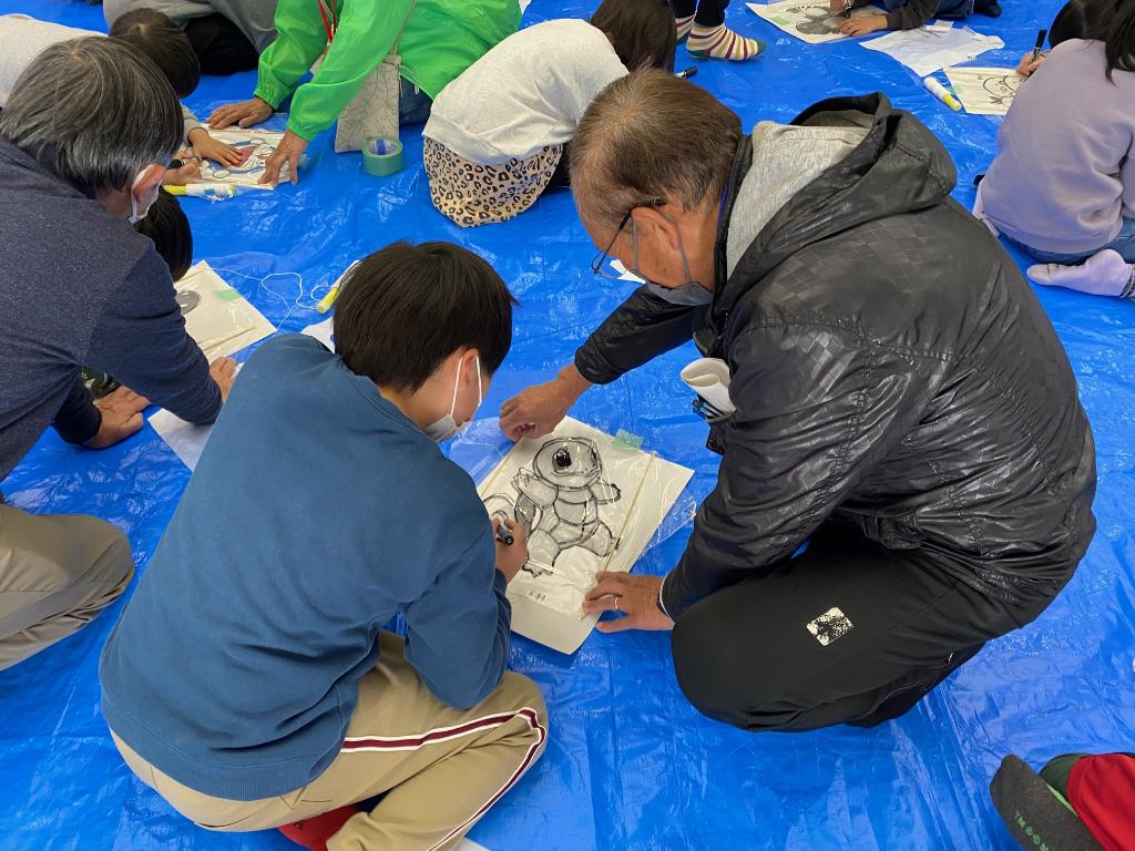 世代間交流会では、国見っ子わんぱく広場の児童61名を含む計95名が参加し、餅つきや凧作りを体験しました。大人も子どもも皆笑顔でつきたてのお餅を頬張っていました。写真は凧作りをしている一場面です。