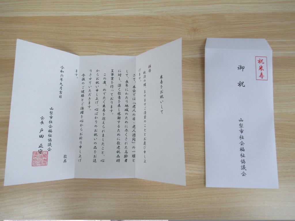 市内在住の高齢者(社協理事会にて決定した年齢)、満88歳の方に対し、記念品をお贈りし、長寿を祝うことを目的に実施。