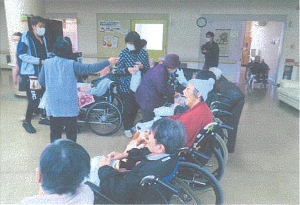 入居者から期待の演芸慰問は、未だ完全には収束しなコロナ感染症の影響で中止とし、今年もお菓子とティッシュペーパーの寄贈だけとなったが、ひとりひとりに直に会話を交えながら手渡しができ、とても喜んでもらえた。