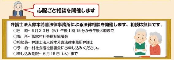 村民の日常生活の心配ごとの相談に対し助言をするとともに、専門家の助言を要する事案については弁護士等に相談を委託し、解決を図る。社協事務所において毎月20日(土、日、祝祭日の場合は前日)午後から弁護士による相談会を実施する。開催案内については、社協や村の広報紙に記事を掲載し周知する。